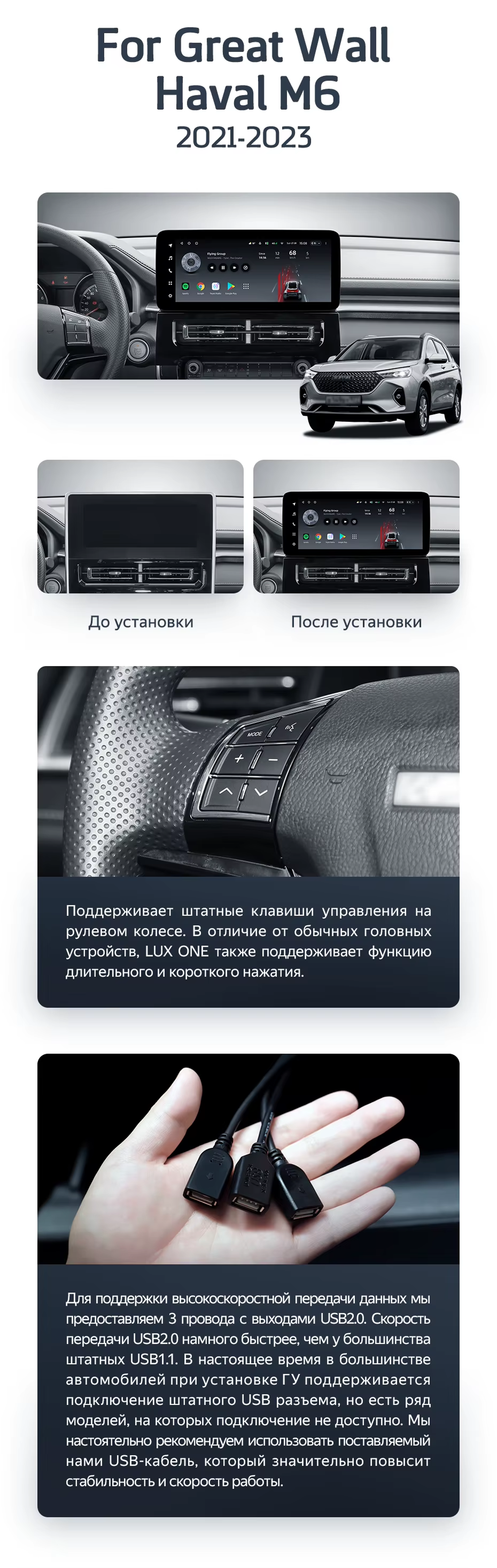 Установочный комплект для Haval M6 (2021-2023) включает переходную рамку и проводку.
