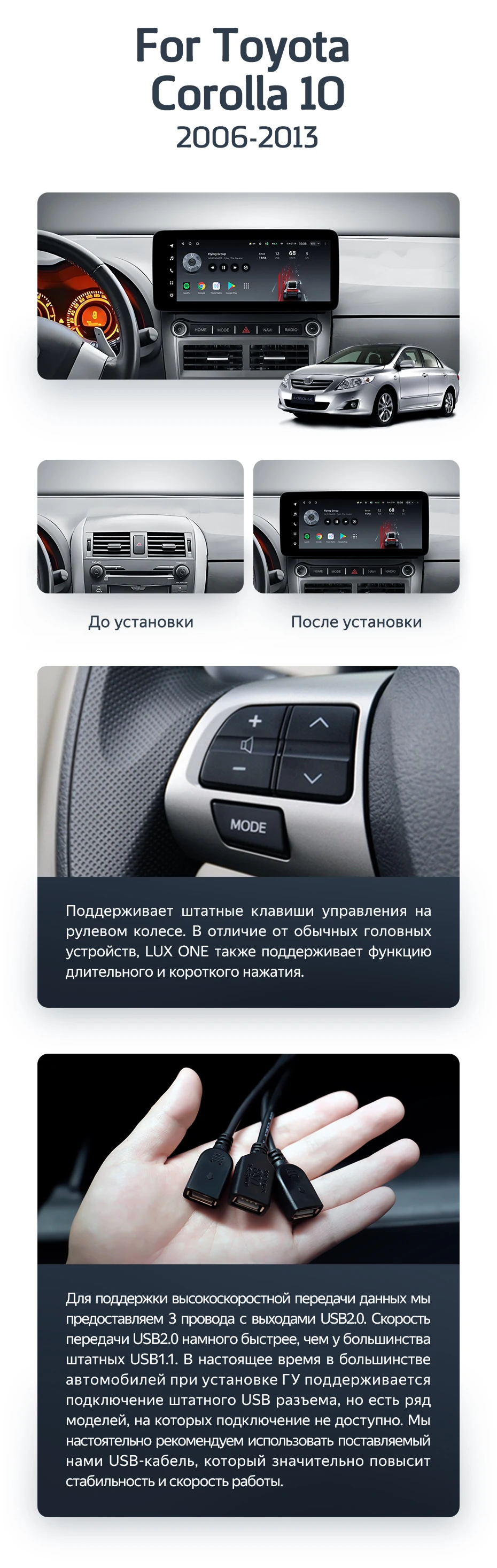 Готовый установочный комплект для магнитолы Toyota Corolla 10 E140 E150 (2006-2013) 12,3 дюйма в штатное место, включает переходную рамку и проводку.